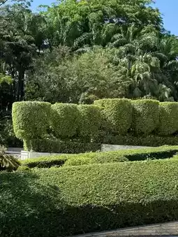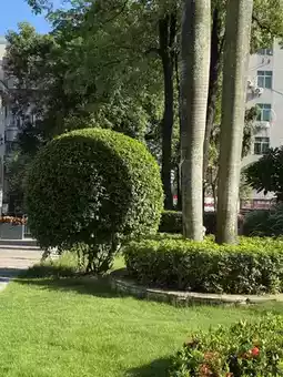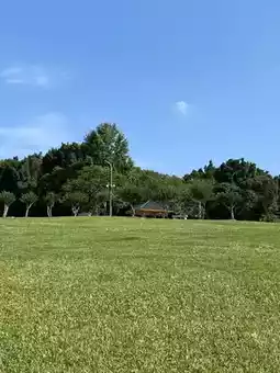 Looking at the blazing sun, I really didn't want to leave the shade. As I entered the park, the view opened up—lush greenery paired with blue skies and white clouds, creating a serene and uplifting atmosphere. Right at the entrance, the neatly trimmed rows of large trees caught my eye, making for beautiful photo opportunities.