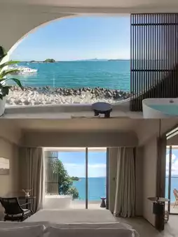 ▪️ Floor-to-ceiling windows with ocean views: 270° panoramic view of Dapeng Bay, watch the tangerine sunset from bed, and fall asleep to the sound of waves at dusk 🌅