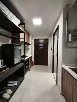 The apartment is conveniently located in a building next to the subway station exit with a wide range of upstairs shops and residences. First take the passenger elevator to the hotel lobby check in, the so-called lobby is actually just converted from a room, relatively simple. After obtaining the password, there is a chance that you will need to transfer to a passenger elevator at another seat number to reach the room. The interior of the room is clean and hygienic, with a cooking stove and outdoor balcony, plus a giant projection screen, which is best for watching movies however, but the washrooms are not separated from dry and wet.