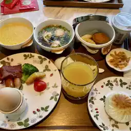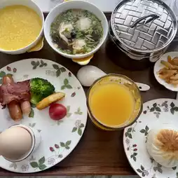 Breakfast is delivered to the room 🍳🥐, offering a fusion of Chinese and Western dishes ☕️🥓. The presentation is very upscale, greatly enhancing my appetite 🫕🍲. There’s a variety of egg preparations, sausages, bacon, salads, and bread 🥗—everything you could want 👍🏼. Special mention goes to the lean pork congee and fresh shrimp wontons, which were exceptionally delicious. "Rich" is the perfect word to describe it 🌈🌈.