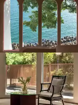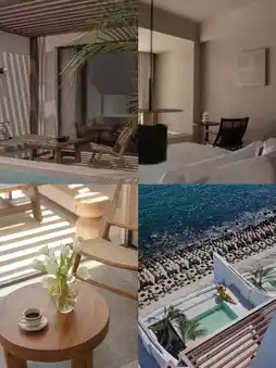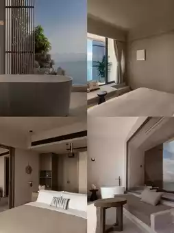 🏡 A Detail Lover’s Dream: White walls, black stone courtyards, cave-style corridors, and floor-to-ceiling pink "Monument Valley" windows create a breathtaking scene under sunlight. Rooms come with Twinings tea, Manner coffee, and Salvatore Ferragamo toiletries. Sink into fluffy Japanese linen beds, and with a tap, electric curtains reveal mountain and sea views from your bed.
