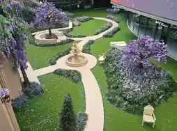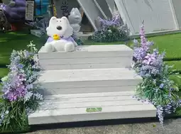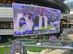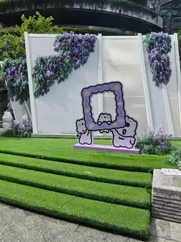 A pop-up store with a western-style church exterior, plus purple flowers and trees as the background, it is a great place to check in.