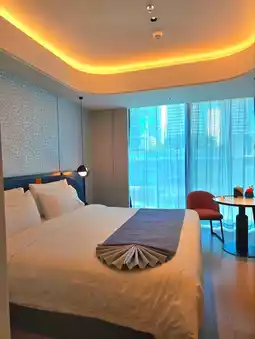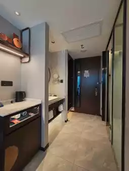 The hotel is located within a commercial building, with the lobby on the first floor. The decor is practical and minimalist. The rooms are reasonably spacious and comfortable, equipped with all the basic amenities, clean and hygienic. There’s a refrigerator and drinking water provided, as well as a self-service laundry room. The view from the room mainly overlooks nearby office buildings and streets. The surrounding environment is quiet, and there’s a convenience store downstairs, making it easy to grab snacks and drinks.