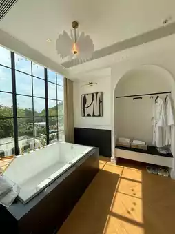 The spacious bathtub in the bathroom is incredibly soothing 🛁
