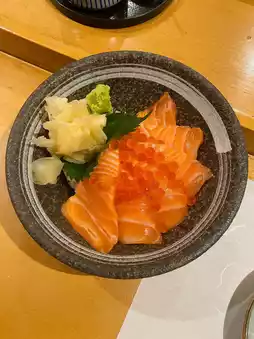 This dish features thick slices of fresh and tender salmon, salmon roe 🐟, pickled ginger 🫚, and a bowl of miso soup. Very satisfying 😌.