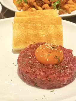The raw beef wrapped in egg liquid is very tender and tastes good. It can also be eaten with bread slices for a richer taste