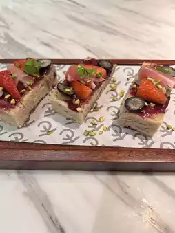 🥩 For the main course, we had steak with seasonal vegetables. The meat was juicy and perfectly cooked, paired with roasted garlic and a rich sauce that was incredibly aromatic. 🍓 For appetizers, the creative combination of prosciutto and berry sauce offered a delightful balance of savory and sweet flavors! Every dish was picture-perfect 📸, providing both a visual and culinary treat ✨.