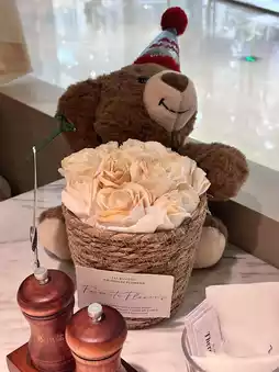 The table was adorned with adorable bear figurines and dried flower arrangements 🎉, adding a touch of ceremony—perfect for birthday celebrations or gatherings with friends 💕. The overall ambiance was very cozy and tranquil, offering a sense of serenity even within the bustling mall 🍃.