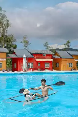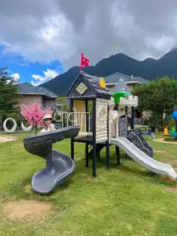 The resort is packed with kid-friendly features: slides 🛝, sandpits, photogenic colorful cabins 🏡, swimming pool 🏊, courtyard BBQ area 🍖, and in-room mahjong table 🀄️. Perfect for gathering mom friends – relax with drinks 🍻 and chats 💬 while the kids play. An ideal summer escape for moms' group trips!