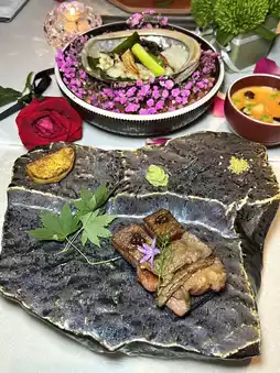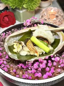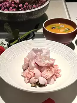The presentation is exceptional, and the broth is sweet and savory. Made with hibiscus flowers from Zhangzhou, Fujian. Using scallops, maitake mushrooms, and hydrangea mushrooms to create a broth, add the hibiscus flowers. 🌷 Served when the hibiscus flowers are 50% ripe.