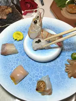 Soy sauce is provided before chopsticks are placed. Enjoy a variety of fresh sashimi at once: yellowtail, starfish, striped squid, cuttlefish with sweet shrimp rolls, tuna, lobster, and sea urchin roe sauce.