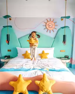 Over the past two years, the hotel has significantly upgraded its family-friendly amenities. For example, the whimsical Utopia Family Suite we stayed in wasn't just about changing the bedding and adding a small slide. The room actually had an octopus-shaped crib, which you could climb onto and slide down. The kids had a blast, excitedly asking to be "Dr. Skin," and they were absolutely delighted. From the walls to the bar, the theme is ocean-themed, and there's even a large slide on the outdoor terrace! 🛝 The immersive atmosphere even surpasses that of a theme park family room. Let's talk about the hotel's quirky utopia, which combines a family restaurant and a kids' club. It features a wide variety of high-end rides, staff members to entertain children, and a variety of hands-on activities every day. The restaurant's food 🍔 is prepared by the hotel's chef and is far superior to those found in shopping malls. If you get tired of playing indoors, you can head to the outdoor playground for some extra relaxation, where the ocean-inspired carousel 🎠 is particularly popular!