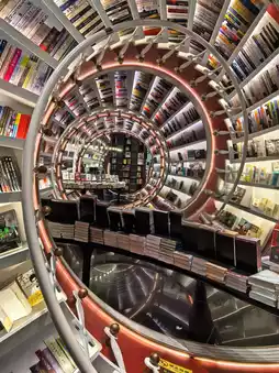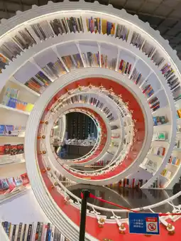 The red spiral bookshelf at the entrance, extending like a space-time tunnel, is also a place for books and an art installation