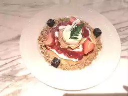 (The French vanilla crepe is beautifully plated, featuring pistachio and almond bits on the outer layer, brownie chunks for decoration, a circle of cream topped with strawberry sauce, fresh strawberries, and a scoop of vanilla ice cream in the center. The presentation is stunning.)