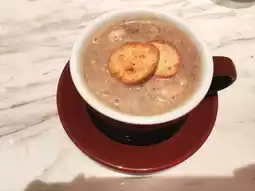 (This mushroom soup has a rich texture, featuring finely chopped mushrooms and mushroom slices. A must-try.)