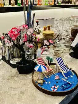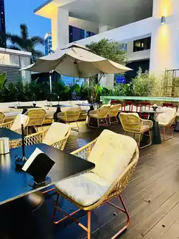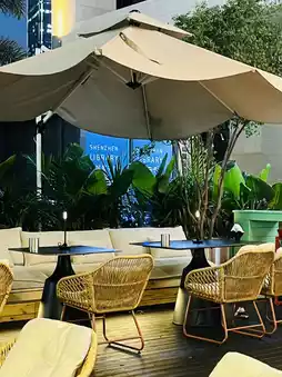 The interior is modern and stylish, and the overall space is spacious and comfortable, with a large outdoor seating area, giving it a camping feel. The owner's service is also very friendly. It wasn't crowded on a weekday evening, so it didn't feel crowded. I ordered a non-alcoholic cocktail and took a sip. It was sour and sweet, with a rich peach flavor and a sparkling water texture. It was very refreshing and perfect for summer. The owner was also very thoughtful and gave me a small snack to go with it. It was awesome!