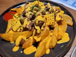 This dish features tender grilled beef ribs served with potato wedges, topped with a thick layer of cheese sauce and Mexican chili sauce. One bite and you'll be hooked!