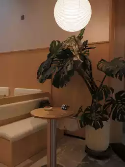 The décor is elegant, with large spherical chandeliers and potted plants.