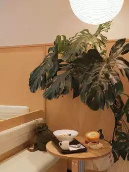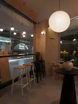 There's a bar and booths, creating a comfortable and bright atmosphere.