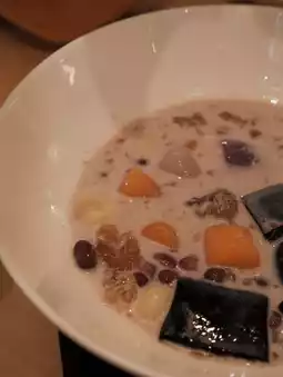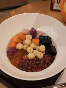 It comes with jelly, three-color taro balls, lotus seeds, red beans, and peach gum.