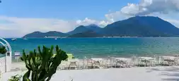 As the guesthouse host, I open the door every day to see blue: the sea water looks like spilled mint-colored paint, distant green hills entwined with clouds, and white tables and chairs on the beach quietly waiting for the sunset.
