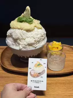 Durian and Mango Milk Shaved Ice: The shaved ice is dense and full of milky flavor 🥛. It's loaded with durian puree 🥭, diced mango 🍑, and transparent pearls ✨, and has a refreshing and clean taste.