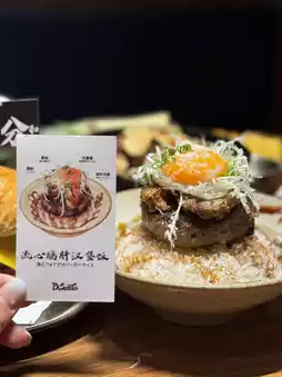 Melting Foie Gras Thick-Cut Hamburger Rice: Poke the aseptic egg 🥚, letting the egg liquid overflow the entire bowl of rice 🍚. The burger patty is thick and the foie gras is creamy.