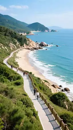 1. **Start: Yangmeikeng Pier** - Rent a tandem bike (30 RMB/hour) and start the **coastal greenway ride** - About 5 km long, with green mountains on the left and the sea on the right, unbeatable scenery!