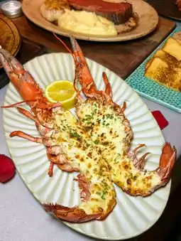 [Butter, Garlic, and Cheese-Baked Boston Lobster] The lobster is baked to perfection, and the cheese coating is grilled to a golden brown. The rich cheese enhances the dish, leaving the lobster meat with a chewy texture and a mouth-watering garlic flavor.