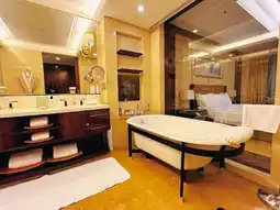 My favorite part is the huge, bright bathroom with excellent views! From the room's window, you can see the pool, and further out, the skyline filled with towering buildings, including the striking Ping An Tower under construction.