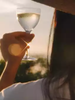at night, back in the room holding a glass of wine, the moon slowly rises,