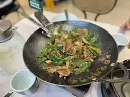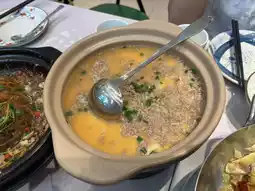 The signature dish is stir-fried pork with green peppers, served in a large portion. Another highlight is the refreshing lemonade, also served in a big glass. Other dishes, such as steamed eggs and stir-fried liver, are equally delicious and packed with bold Chinese flavors.