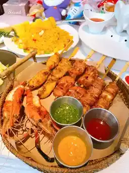 🌟🍢 Thai Grilled Skewer Platter: Eel, chicken, and prawns, all tender and juicy.