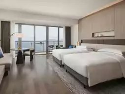 The deluxe sea-view rooms are approximately 45 square meters, equipped with floor-to-ceiling windows offering direct views of the ocean, a comfortable bed, a balcony, and a smart control system. Each room includes a Nespresso coffee machine, a minibar, and a marine-themed bathroom. Guests can wake up to stunning views of the blue sky and ocean, providing a truly therapeutic experience. The bedding is soft, soundproofing is excellent, and the rooms are clean and bright. Daily housekeeping is provided twice, and L’Occitane toiletries are used.