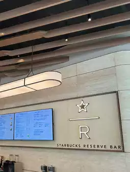 The **Starbucks Reserve Bar** in the park is bright, with wooden ceilings and white walls accented by gold chandeliers, giving it an unexpectedly holiday feel.
