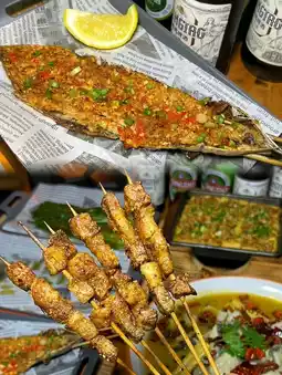 The food here is truly delightful. In addition to the tender barbecued lamb skewers, the slightly spicy and crispy saury, and the refreshingly crispy grilled leeks, there are also many surprising dishes, including the sour and spicy pickled fish, the juicy tofu, the rich and fragrant braised dried tofu, and even the Hong Kong-style fried noodles, which are springy and flavorful. Paired with a refreshing dish of mustard cucumber, the restaurant also offers a wide selection of drinks, offering excellent value for money.