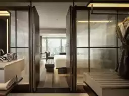 The lobby features a modern Oriental ambiance with a black, white, and gray color scheme. The entrance water feature and frosted glass design create a misty and private atmosphere. Guests are welcomed with seated check-in services, complete with sofas, welcome tea, and hand towels. A unique in-room fragrance selection service (with three aroma options) adds a touch of ceremony to the stay.