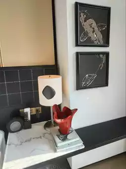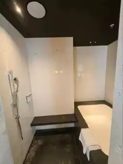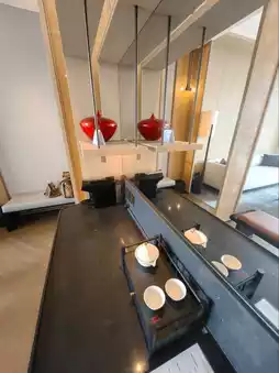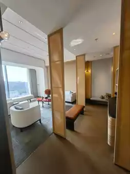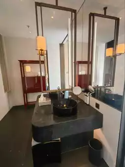 Upgrading to a suite, I simply asked during check-in if there was a sea view, and immediately received a second upgrade. The overall design is centered around the concept of "Chinese aesthetics in everyday life." Bamboo, wood, and lacquered woodwork cleverly blend local culture with modern luxury, creating a unique oriental aesthetic. Inspired by the "tide culture" of leaping fish, HUALUXE Bao'an incorporates the dynamics of waves into architectural lines and decorative details. For example, the lobby's art scroll depicting a dancing fish creates a majestic atmosphere. The furniture features predominantly square lines, creating a perfect separation between the living and bedroom areas. The bathroom features multiple mirrors, a three-part structure, double sinks, and an oversized bathtub. There are both a master and guest bathroom.