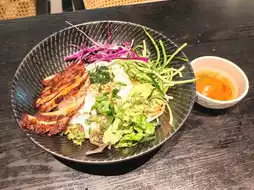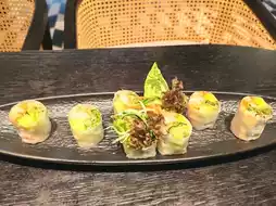 (The snack platter has lemongrass chicken skewers, Vietnamese spring rolls, fish cakes, and flour; the skewers and spring rolls are very tasty, the fish cakes are not chewy enough.)