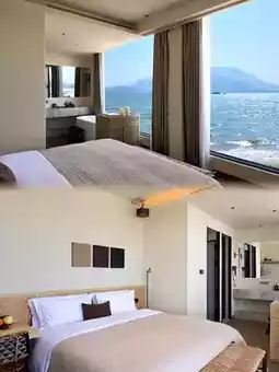 Afternoon time is meant for terrace tea. Ordering a fruit platter and sparkling wine, sitting under a beige sunshade, watching the waves kiss the shore again and again. My girlfriend takes photos in front of the courtyard’s green plant wall; the red brick archway paired with her light-colored dress, the sea breeze lifting her skirt, every shot looks like a "pretend Santorini" masterpiece, and my phone’s memory quickly runs out. When I don’t want to daydream, I borrow a bike from the guesthouse and ride along the coastal road toward Yangmeikeng, accompanied by the blue sea and green mountains all the way—much freer than taking a sightseeing bus.