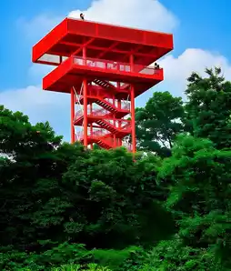- Top floor of the panoramic tower for an overhead view of the red boardwalk winding like a ribbon!