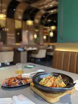 The indoor dining room with plant accents plus art painting decoration is a good choice for gatherings and family tea. The seats are big enough and not crowded.