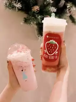 A strawberry milk tea topped with a pink “snow mountain” made of whipped cream and freeze-dried strawberry powder.