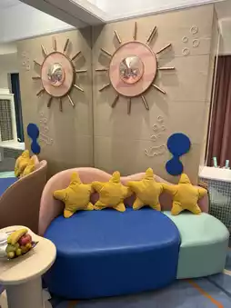 This time we stayed in the ocean-themed family suite. The kids were immediately drawn to the crab-shaped tent bed upon entering! The room also featured a star-shaped sofa, a giant bathtub, and a playhouse with a huge white rabbit plush toy! So sweet!
