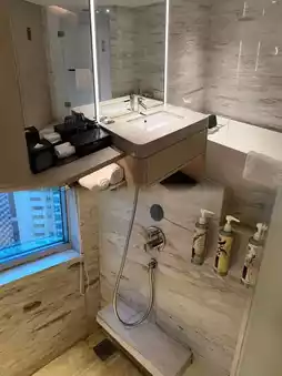 The moment you enter the hotel lobby, you feel the upscale atmosphere. The decor is elegant and grand, and the front desk staff are extremely friendly, processing check-in quickly without making me wait at all. The rooms are spacious, well laid out, and filled with natural light. Lying in bed, you can enjoy the outside view. The room is equipped with a separate bathtub, free Wi-Fi, and floor-to-ceiling windows with city views. The toiletries are from premium brands, very comfortable to use with a pleasant fragrance. There’s also complimentary mineral water replenished daily, which feels very thoughtful.