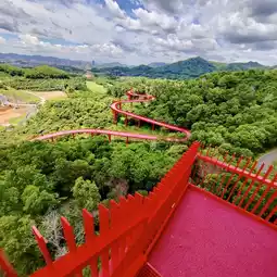 kilometers long and every 350 meters there are stairs leading down to the ground incase of emergencies or if you’re exhausted. It takes about 2 hours to walk back and forth, and is surrounded with trees.