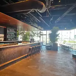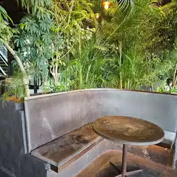 The café on the 4th floor of a fashion building along the main street features a spacious area with greenery and an open terrace.