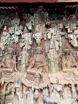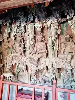 On the back is a group of small hanging sculptures of Mount Xumi, and on both sides are pavilions, towers, arhats and guardians. In the middle are the original sculptures of the three great bodhisattvas from the Ming Dynasty. In the middle sits Guanyin, with Manjusri on the left and Samantabhadra on the right. Below them are their respective mounts, namely the one-horned roar, the six-tusked white elephant, and the blue-haired lion.