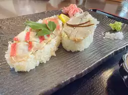 At the restaurant, you can enjoy dishes made with fresh local seafood. For example, the "Grilled Local Kinmedai Sushi and Soba Set" is an exquisite match of the umami of the Kinmedai and the flavor of the soba, and has received high praise from many customers. There are also plenty of dishes unique to Shimoda, such as "Shimoda Curry Udon" and "Simmered Golden-Eyed Snapper Set Meal."