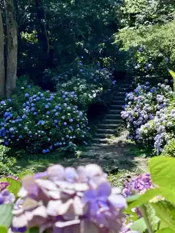 Every June, Shimoda Park transforms into the most romantic spot in town. Nearly 3,000 hydrangea bushes bloom in unison, cascading down the slopes and stone steps like a sea of clouds, creating a breathtaking floral spectacle for this charming harbor town. Unlike the neatly arranged hydrangeas in urban settings, Shimoda's hydrangeas exude a natural, untamed beauty, forming a picturesque scene with their scattered yet harmonious arrangement.